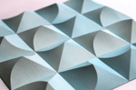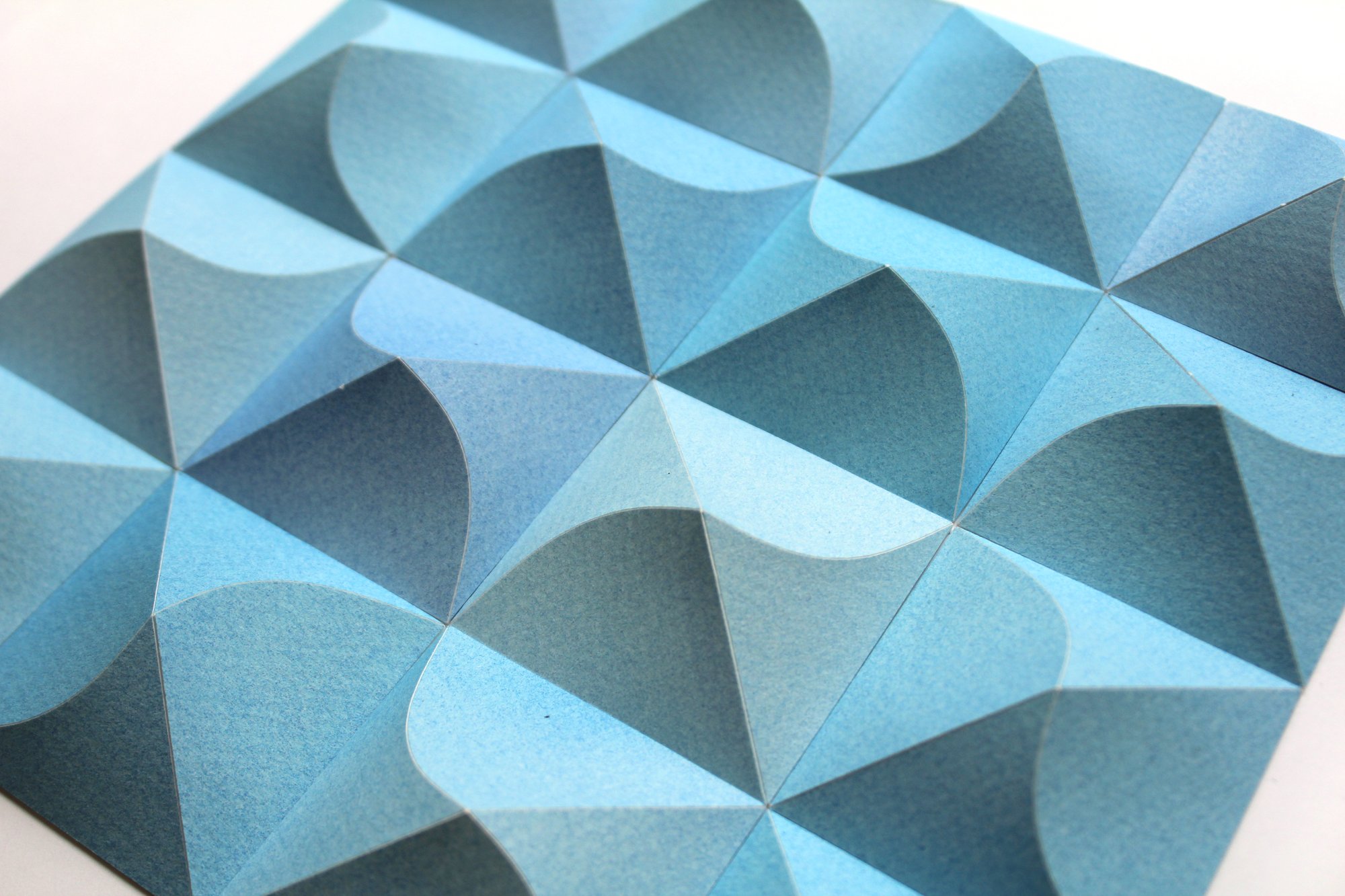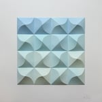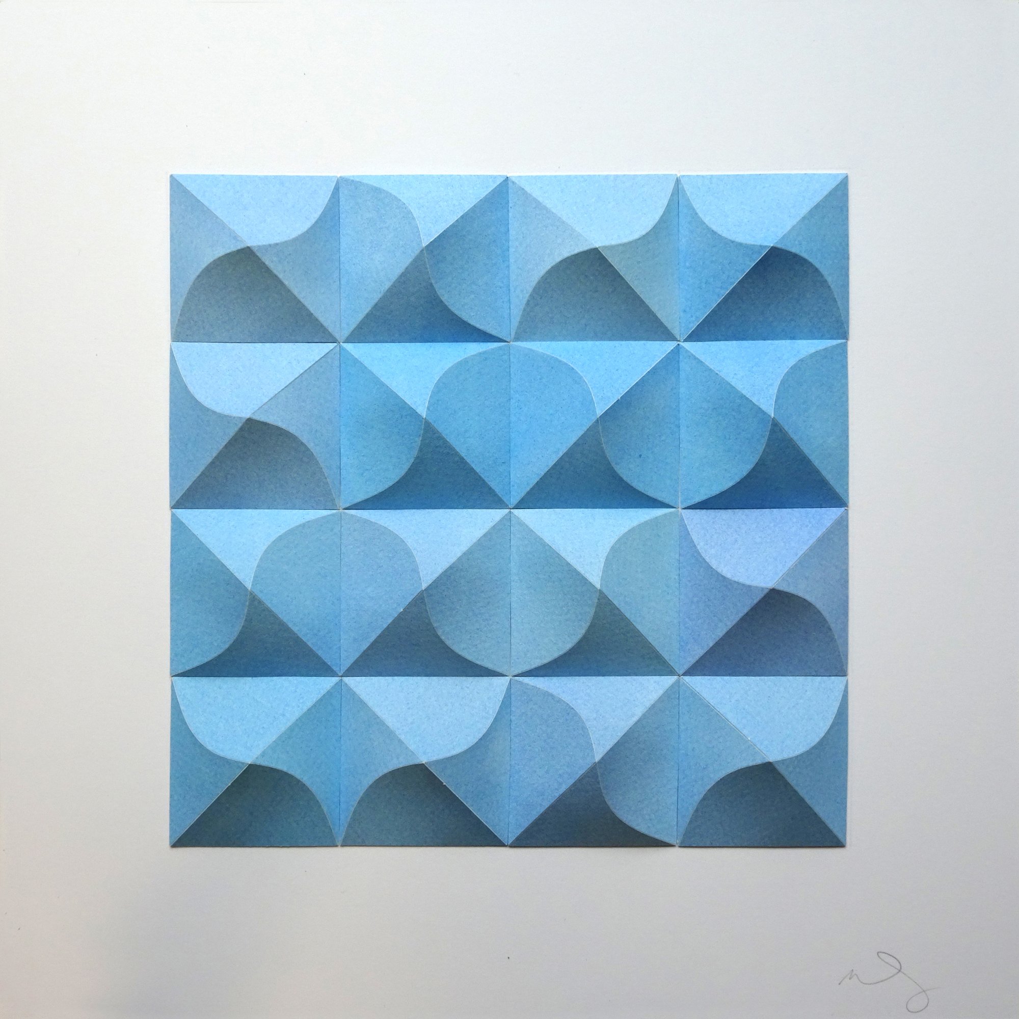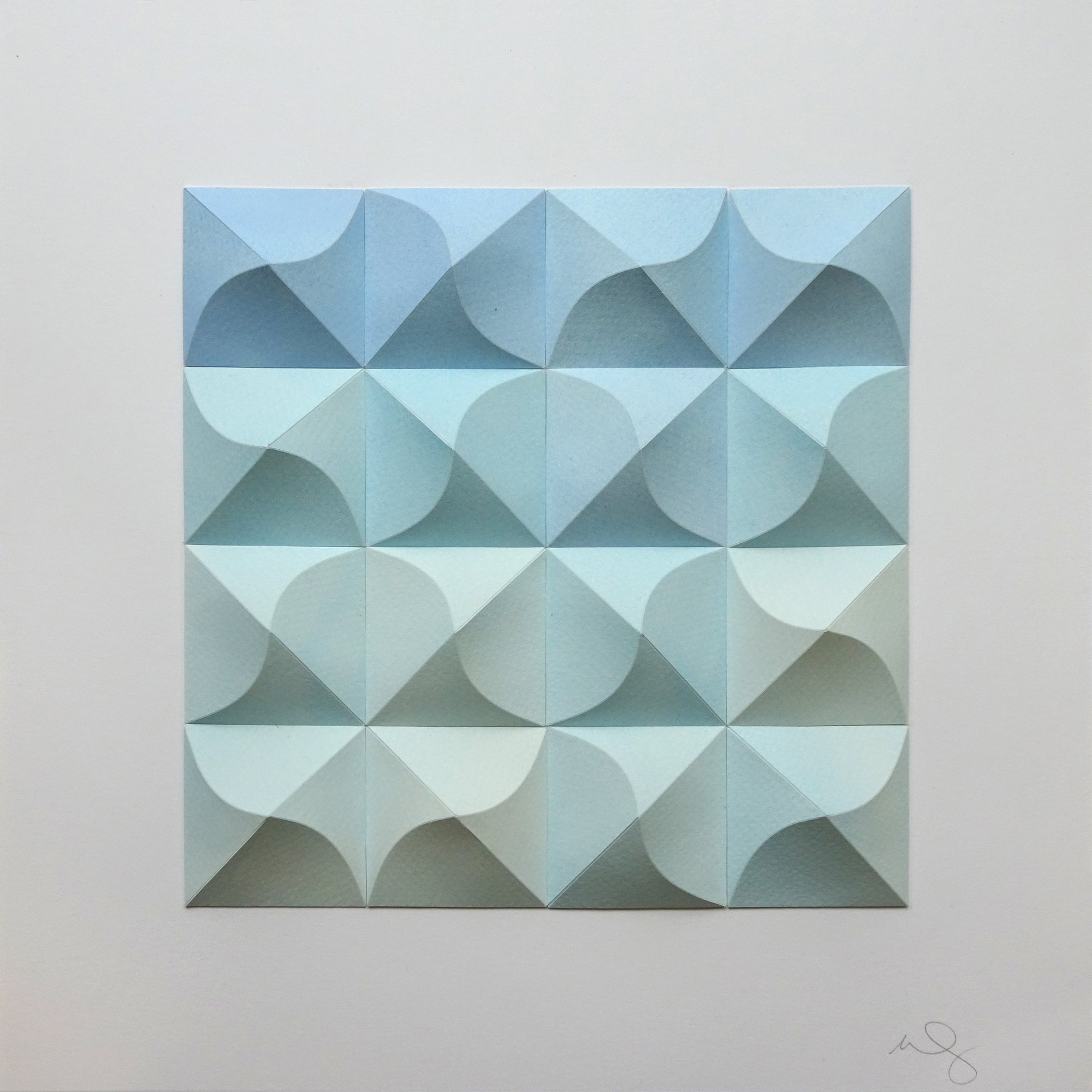 Each Omoplata is made of 16 modular units with gouache wash applied before assembly. All the pieces in the series are in a blue / light blue / blue green range in tone. Each piece is unique and will exhibit a range of value as light falls on the curve folded modular shapes.